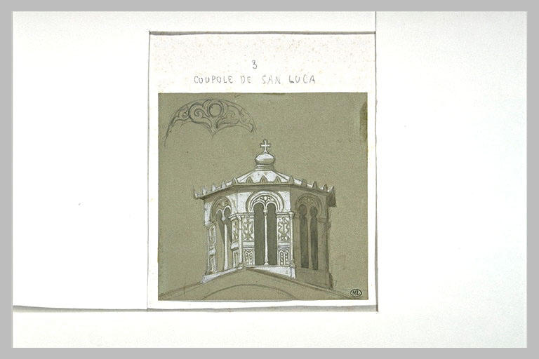 Mine de plomb et aquarelle, avec rehauts de gouache blanche, sur papier vert. Annotation au-dessus du dessin, à la mine de plomb :COUPOLE DE SAN LUCA