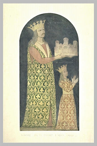 Copie d'une fresque de l'église du monastère de la Grande Lavra. Il devrait s'agir, sauf erreur de notre part, en réalité de l'empereur Jean Ier Tzimisces (925-976) monté sur le trône de l'empire d'Orient en 969 et de son fils consacrant à Dieu le monastère de la Lavra. Il existe cependant quelques différences entre ce qu'a dessiné Papety et la fresque actuelle (détails vestimentaires, la barbe, la légende et l'église présentée). Rappelons que les fresques du catholicon sont attribuées au peintre crétois Théophane. (C. Legrand (sous la dir. de), Musée du Louvre, Département des arts graphiques, Musée d'Orsay, inventaire général des dessins, Ecole française XIII, de Pagnest à Puvis de Chavannes, Paris, RMN, 1997, n° 326, p. 83.) Voir également l'esquisse RF 1773.10
