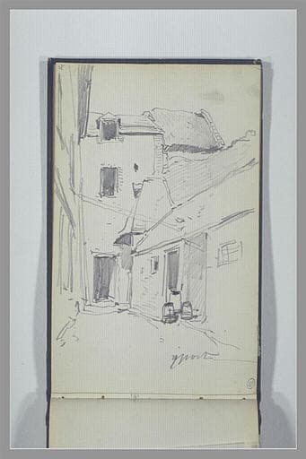Album Isabey Eugène -9-, folio 14., dessiné au recto ; Album à couverture cartonnée recouverte de papier grenu violet. Sur le plat de devant, en lettre ornées or : Album. Couverture : H : 0,113 ; L : 0,180. Feuillet : H : 0,108 ; L : 0,174. Etiquette collée en haut à gauche sur le plat de devant, inscription à l'encre : E. Isabey 9 ; au crayon : 14 bateau