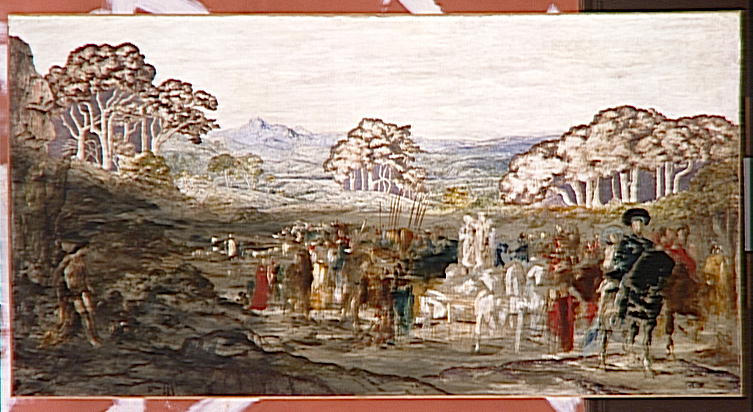 scène (Le fils prodigue, foule, cheval, char) ; fond de paysage (colline, forêt, plaine)