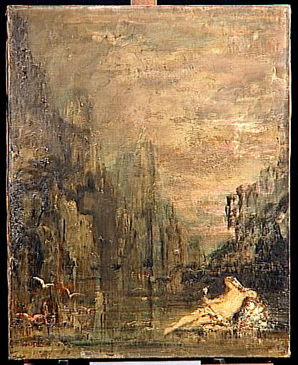 paysage (montagne, eau, ciel, oiseau) ; figure (fée : femme, couché sur le côté, nudité, dans les eaux)