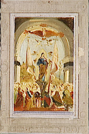 scène (Sainte Ursule de Cologne, palme, bannière de procession, foule)