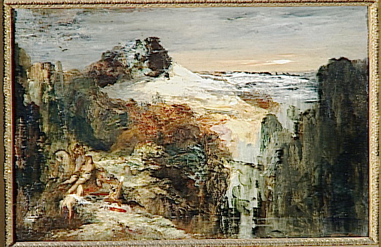 paysage (montagne, neige, gorge) ; scène (Cyrus : homme, décollation, Tomyris : femme, couché sur le côté, bourreau : sabre, vase : sang, antiquité :Romain)