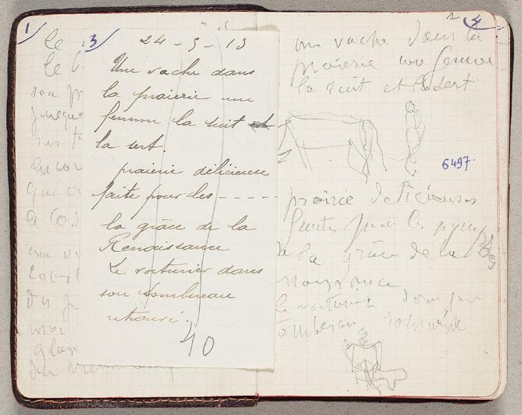 numéro à l'encre violette (face) : 4 ; numéro de folio au crayon graphite (face) : 1 ; annotation au crayon graphite (face) : une vache dans la prairie une femme la suit et la sert prairie délicieuses fruits pour les nymphes - la grâce de la naissance le voiturier dans son tombereau... ? ; annotation au crayon graphite (verso) : bien que nous soyons un animal nous sommes l'âme visible de la terre charette toute la famille la mère la fille grandelette même regard adressé à 20 ans de distance - Mon coeur n'a pas de rides il reçoit encore toute l'impression des (femmes) (sur le folio 2 recto)