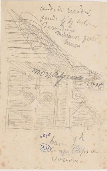annotation au crayon graphite (face) : enfant de Mme Merill a.. Rousaud Lundi 1 heu Mr Walcot (?) ... 700 (manque) Vendredi... (?) Jeudi 41-42 de la Beraudiere minium porte musee - Montesquiou carte bain 9 h coupe corps a Varenne