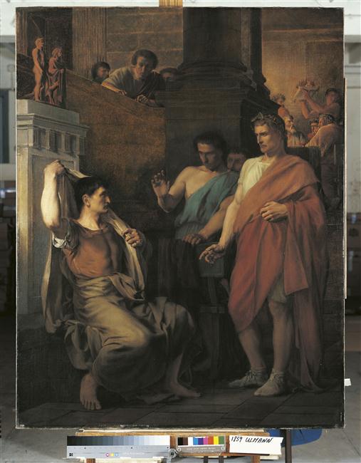 scène historique (Coriolan, homme politique, Tullus, assis, intérieur, palais, antiquité : Romain, Volsque)