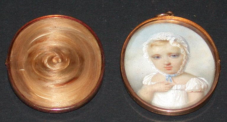 miniature ovale sur ivoire dans un grand médaillon bordure d'or, avec mèche de cheveux