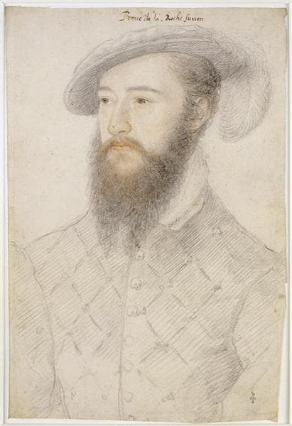 On remarquera les boutons du pourpoint en forme de tête de mort, ce qui peut signifier que le prince porte le deuil du roi François Ier