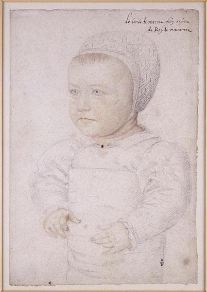 Le fils aîné de Jeanne d'Albret et d'Antoine de Bourbon, Henri, duc de Beaumont, naquit le 21 septembre 1551 au château de Coucy, mais mourut accidentellement à La Flèche le 20 août 1553, avant d'avoir atteint ses deux ans, suite aux soins maladroits de sa gouvernante, Aimée de Lafayette, baillive de Caen, qui avait déjà élevé Jeanne d'Albret et était une compagne de Marguerite de Valois ; selon les contemporains, la vieille femme l'aurait tenu trop serré dans ses langes dans une pièce surchauffée et il serait mort asphyxié. Sa mort faisait donc du petit Henri, qui naquit quelques mois plus tard le 13 décembre 1553, l'héritier de la Navarre. Par la suite, le 19 février 1555, naquit un petit Louis-Charles, titré comte de Marle, qui mourut lui aussi avant l'âge de deux ans, en novembre 1557, sa nourrice l'ayant par imprudence laissé tomber et ne l'ayant pas fait soigner pour dissimuler sa faute. Il fut enterré dans l'église Notre-Dame d'Alençon. A sa mort le jeune Henri n'avait donc que quatre ans à peine. L'inscription portée sur le dessin : Le conte de Merne filz aisné / du Roy de Navarre est donc contradictoire ; elle indique qu'il s'agit du fils aîné, mais le titre de comte de Marle désigne au contraire le cadet, et enfin aucun de ces enfants n'est le fils du roi de Navarre, mais son petit-fils. Henri eut également deux soeurs, une petite Madeleine (1556-1556), morte en bas âge, et enfin Catherine de Bourbon, duchesse de Bar (1559-1604), dont il resta proche toute sa vie.