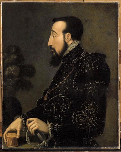 portrait (Henri II, roi de France, homme, à mi-corps, de profil, barbe, col : dentelle, bijou, épée, horloge, casque : plume)
