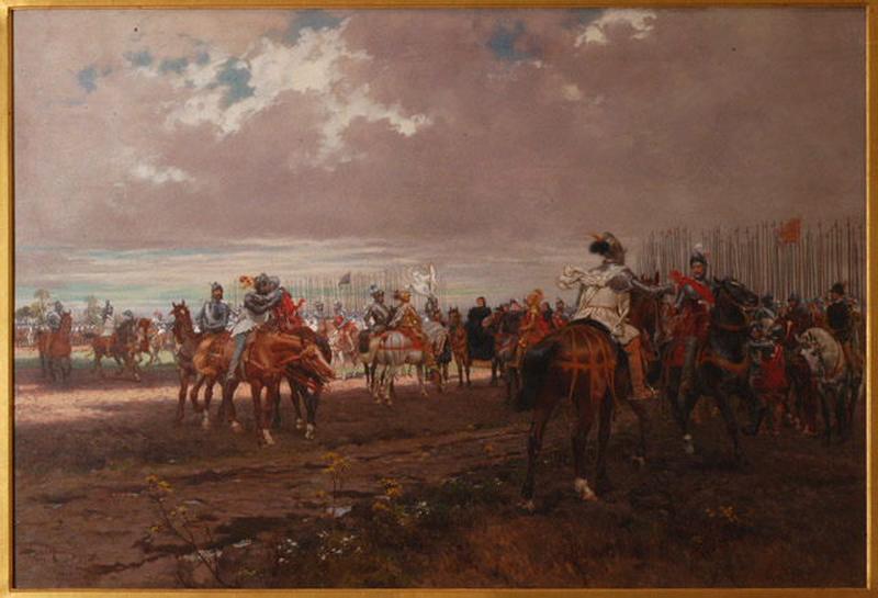 scène historique (Guerres de religion, entrevue, catholicisme, protestantisme, Toury, cavalerie, Coligny Odet de, Coligny Gaspard II de, Condé Louis Ier de, Catherine de Médicis, Bourbon Antoine de, cavalerie, armure, casque, harnachement, lance, drapeau, pennon, gonfanon)