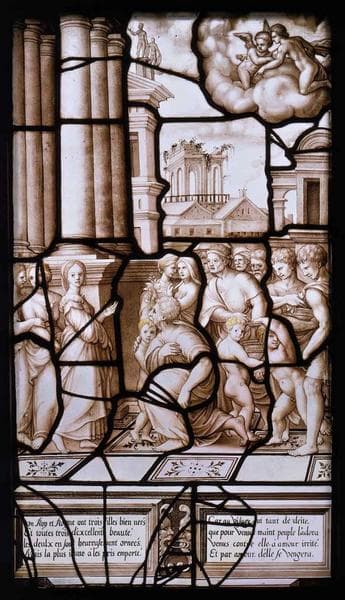scène mythologique (Psyché, femme, famille, Cupidon, Vénus, jalousie) ; vue d'architecture (colonne, ville) ; ornementation (mascaron orn)