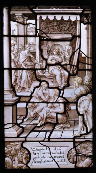 scène mythologique (intérieur, palais, roi, reine, trône, famille, jeune fille, tristesse) ; ornementation (satyre)