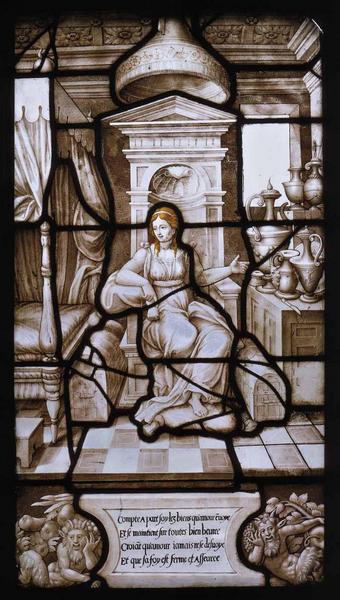 Episode 14 : Sur ce vitrail, pure composition du maître verrier, Psyché s'ennuie. L'époux invisible lui a interdit de chercher à le voir sous peine de le perdre. Elle souhaiterait revoir ses soeurs qu'elle entend se lamenter au pied du rocher où elle avait été déposée. Cupidon, qui connaît leur jalousie, hésite à satisfaire ce désir avant de céder