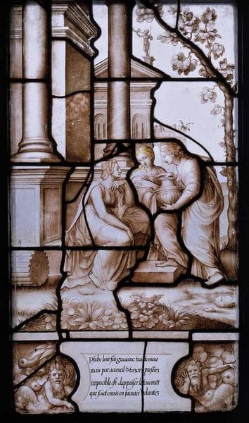 scène mythologique (palais, colonne, Psyché, famille, femme, richesse) ; ornementation (satyre)