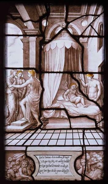 scène mythologique (Vénus, dispute, Cupidon, Junon, Cérès) ; vue d'intérieur (chambre, lit, baldaquin) ; ornementation (satyre)