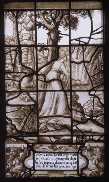 Episode 30 : Ce vitrail, sérieusement endommagé, nous montre, à gauche, Psyché, au désespoir, tentant de se précipiter dans le fleuve. Au centre un roseau mélodieux la convainc d'abandonner ce projet et lui conseille de ne pas approcher ces brebis fort dangereuses, mais de recueillir quelques brins de leur laine d'or sur les branches des arbres qui bordent le fleuve où elles vont s'abreuver