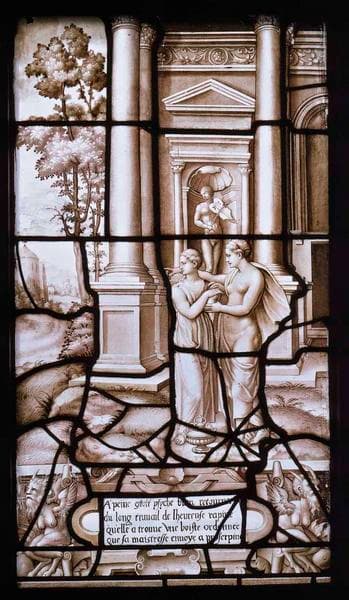 scène mythologique (Psyché, Vénus, vase) ; vue d'architecture (colonne) ; ornementation (être fabuleux)