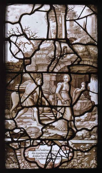 scène mythologique (Psyché, rencontre, homme, âne) ; vue d'architecture ; ornementation