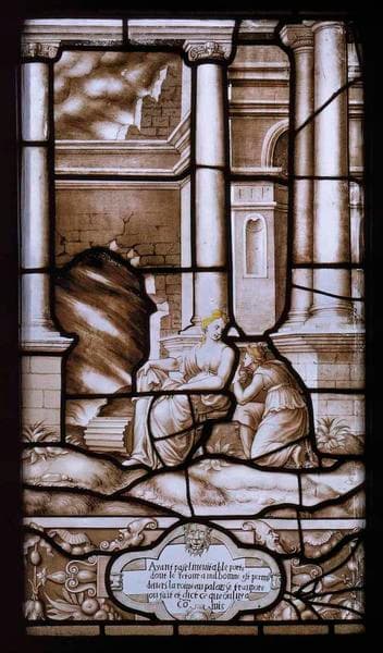 Episode 36 : Suivant la recommandation de la Tour, Psyché n'accepte ni siège ni autre nourriture que du pain noir. Le plomb qui la sépare de Proserpine renvoie ces deux femmes à leur solitude respective. L'agenouillement de Psyché est appuyé par une courbe de plomb qui, dans le prolongement des colonnes hautes, pèse sur ses épaules