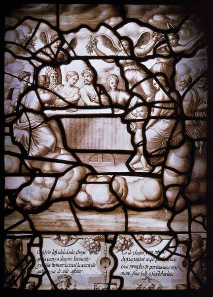 Episode 41 : Un grand banquet est donné pour les dieux, au cours duquel Psyché va goûter à l'ambroisie et devenir immortelle. La référence à La Cène de Léonard de Vinci est évidente. Trois nymphes jettent des violettes sur les convives. Au centre, le niveau d'architecte signe sans doute le travail d'un compagnon ou d'un maître. Il symbolise aussi l'équilibre auquel Psyché est enfin parvenue