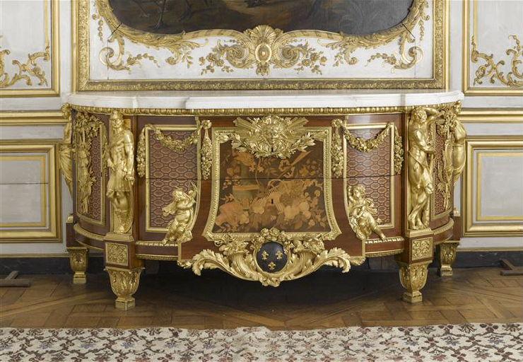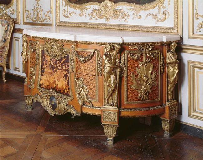 Conçue pour l'appartement de l'intendant du Garde-Meuble de la Couronne en 1775 par l'un des plus grands ébénistes du règne de Louis XVI, cette commode servit ensuite à l'ameublement du consul Cambacérès dans son hôtel parisien, puis devint la propriété du roi Louis-Philippe par héritage. Le duc d'Aumale la racheta en 1857. De retour d'exil il la fit placer dans le salon de musique puis après les travaux de reconstruction du Grand Château dans la Tribune. Voisine de celle créée par le même ébéniste pour la chambre du roi à Versailles, elle offre quelques éléments caractéristiques : décrochement central trapézoïdal, fonds mosaïqués et tableau de marqueterie d'une exceptionnelle qualité d'exécution.