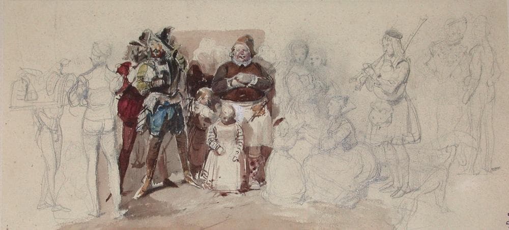 Divers personnages en costumes d'époque Renaissance (recto); Divers croquis de personnages et cavaliers (verso). ; Album de dessins : Voyage en Angleterre, Quadrille de Marie Stuart et Camp de Lunéville, volume in-folio oblong, maroquin rouge.