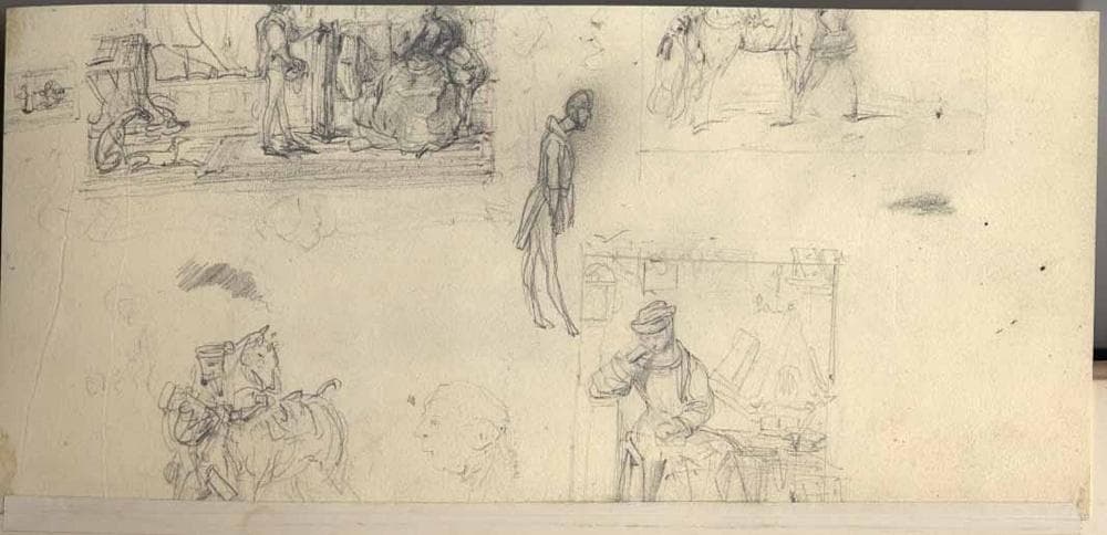 POP | Plateforme ouverte du patrimoineDivers personnages en costumes d'époque Renaissance (recto); Divers croquis de personnages et cavaliers (verso). ; Album de dessins : Voyage en Angleterre, Quadrille de Marie Stuart et Camp de Lunéville, volume in-folio oblong, maroquin rouge.