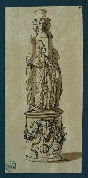 vue d'architecture (colonne, sculpture, femme, bucrane)