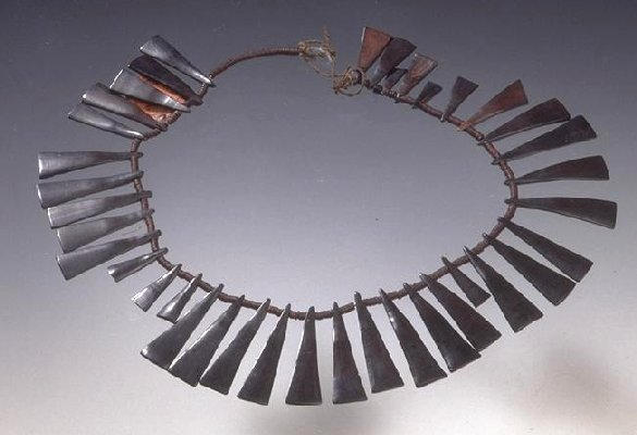ce collier rassemble 38 pendentifs triangulaires en coques de fruits séparés par des perles plates