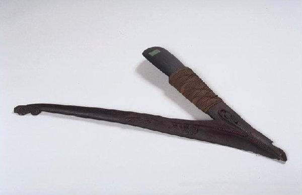 Certaines herminettes et haches, comme celle-ci, sont des objets cérémoniels ou des insignes de rang social. Parfois transmis de génération en génération, ils présentent un symbolisme relatif à leur histoire, à la nature et à l'origine des matières qui les constituent