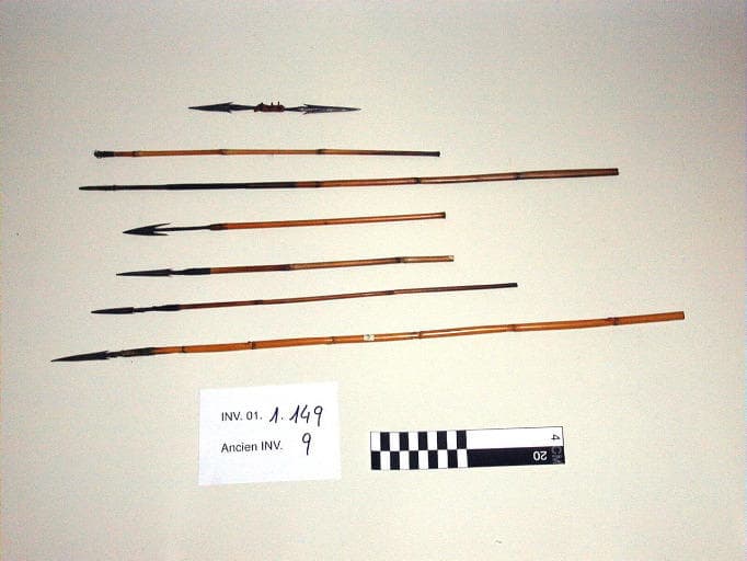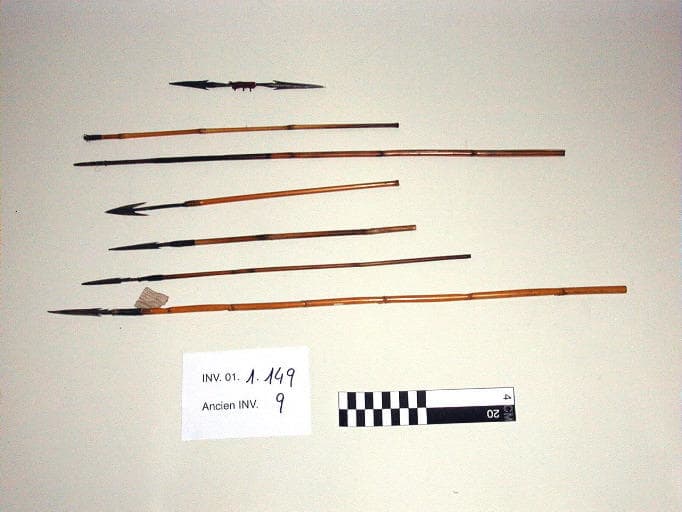 flèches et pointes de flèches a- 1 grande flèche (portant n°9) avec pointe de métal décorée par motifs incisés de traits obliques, fixée par une cordelette. ; b- 1 flèche moyenne avec une fine hampe et une pointe métal. fixée par un lien végétal. ; c- 1 petite flèche avec une courte hampe et une pointe fixée par un lien végétal. ; d- idem ; e- 1 flèche avec une longue hampe décorée de différentes teintes et une partie en section carrée; un fil de cuivre servait à fixer la pointe aujourd'hui disparue. ; f- hampe moyenne et lien végétal (pas de pointe) ; g- 2 pointes de flèches fixées par un petit tissu rouge et 3 fil de fer. ; h- 1 hampe en bois cassée (pas sur la photos)