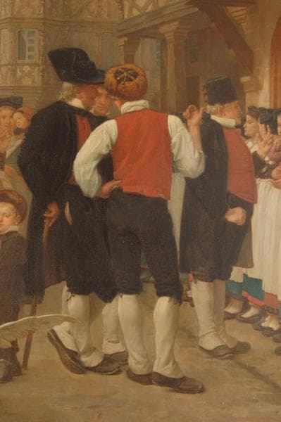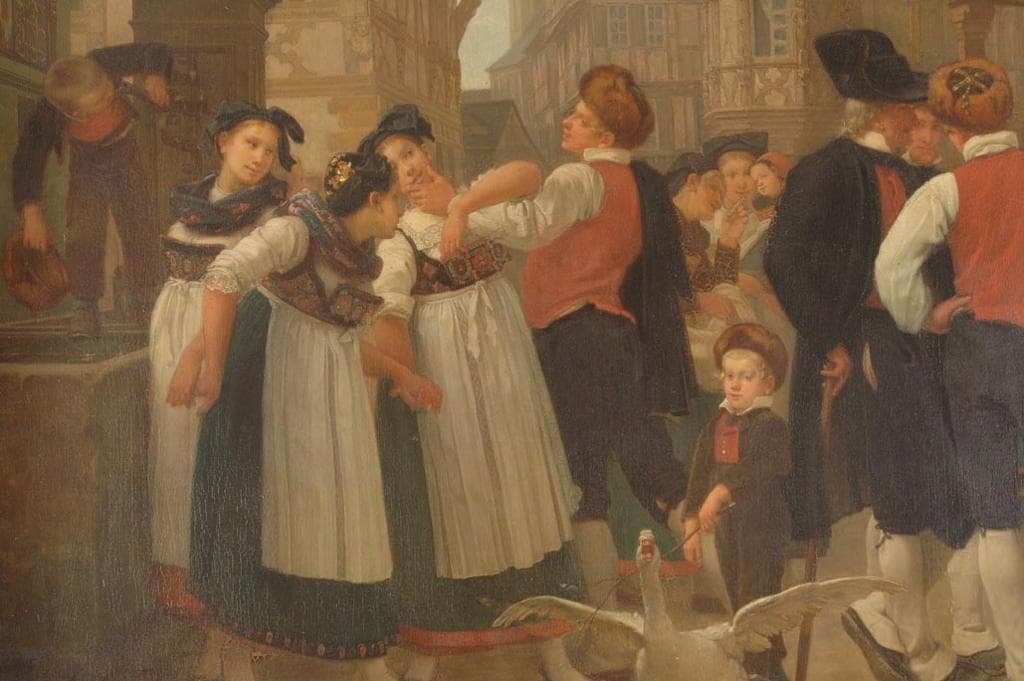 scène (bourgeois, femme, enfant, costume traditionnel, rue, fontaine, lion, écu, oie, canard, maison)