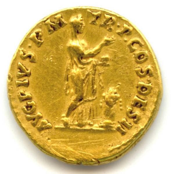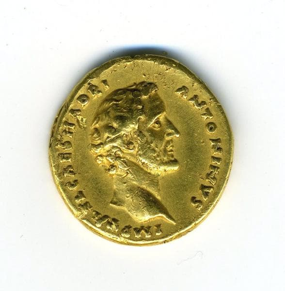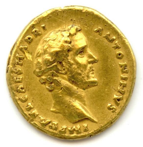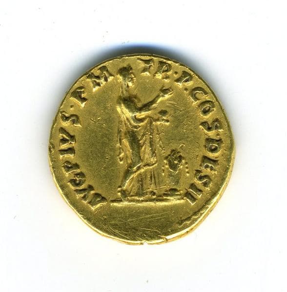 Antonin le Pieux (86-161), en latin Titus Aelius Hadrianus Antoninus Pius, empereur romain (138-161). Son règne marque l'apogée de l'empire romain. Avers IMP, 'Imperator, empereur' est le titre conféré sous la république romaine aux généraux en chef victorieux. A partir d'Auguste, l'empereur, toujours associé à la victoire en fit son prénom officiel. T, Titres (son nom propre) AEL, Aelius (l'héritier présomptif mort le 25 février 138) CAES, Caesar (César), héritier présomptif HADRI, Hadrianus (nom de son père adoptif) ANTONINVS, son nom propre Revers AVG (Augustus) : c'est là un titre honorifique, décerné au premier empereur C. Julius Caesar Octavianus (27 av. JC - 14 ap. JC). Les successeurs d'Octave Auguste adoptèrent ce cagnomen (surnom). PIVS : Antonin fut surnommé le ' Pieux ' par le Sénat, soit parce que, après la mort de Hadrien il avait proposé de lui rendre les honneurs extraordinaires, soit parce qu'il était d'un caractère extrêmement doux et que ses contemporains n'eurent à lui reprocher aucun acte de cruauté. P.M. Pontifex Maximus. Très grand pontife. Jules César et Octave Auguste avaient été Pontifes Maximi. Cette dignité, qui les rendait Présidents du Collège des Pontifes et ainsi maîtres de la religion romaine, fut octroyée à leurs successeurs. TR P : Tribunitia Potestas, investi de la puissance tribunitienne. La 'Puissance tribunitienne' que l'empereur Octave Auguste avait reçue du Sénat l'an 23 av. J. Chr. fut accordée à ses successeurs. Auguste avait eu soin de se la faire attribuer pour s'assurer l'inviolabilité. La Tribunitia Potestas est à la fois perpétuelle et annuelle : perpétuelle parce qu'étant concédée sans limite de temps ni de bien et annuelle parce que, à chaque nouvelle année de règne, l'Empereur ajoute une unité au chiffre de ses Puissances Tribunitiennes. Ce nombre figurant dans les inscriptions monétaires et qui sont Tribunitia Potestas (toujours en abrégé) donne la date de l'émission. Antonin le Pieux ayant reçu la première Trib . Pot. le 25 février l'an 138, il prend le titre de Trib. Pot. II le 10 décembre de la même année (depuis Trajan, ses successeurs choisirent toujours la date du 10 décembre comme point de départ pour le calcul de leurs Puissances Tribunitiennes). Il l'a eue 24 fois. Cas Des II : désigné pour être consul pour la deuxième fois. Les empereurs romains depuis Auguste se faisaient décerner le titre de Consul en souvenir de l'époque républicaine. En 120 : Cas En 139 : Cas II En 140 : Cas III En 145 : Cas IIII Les pièces avec cette légende sont les plus rares parmi les 1300 types des 23 années de règne.