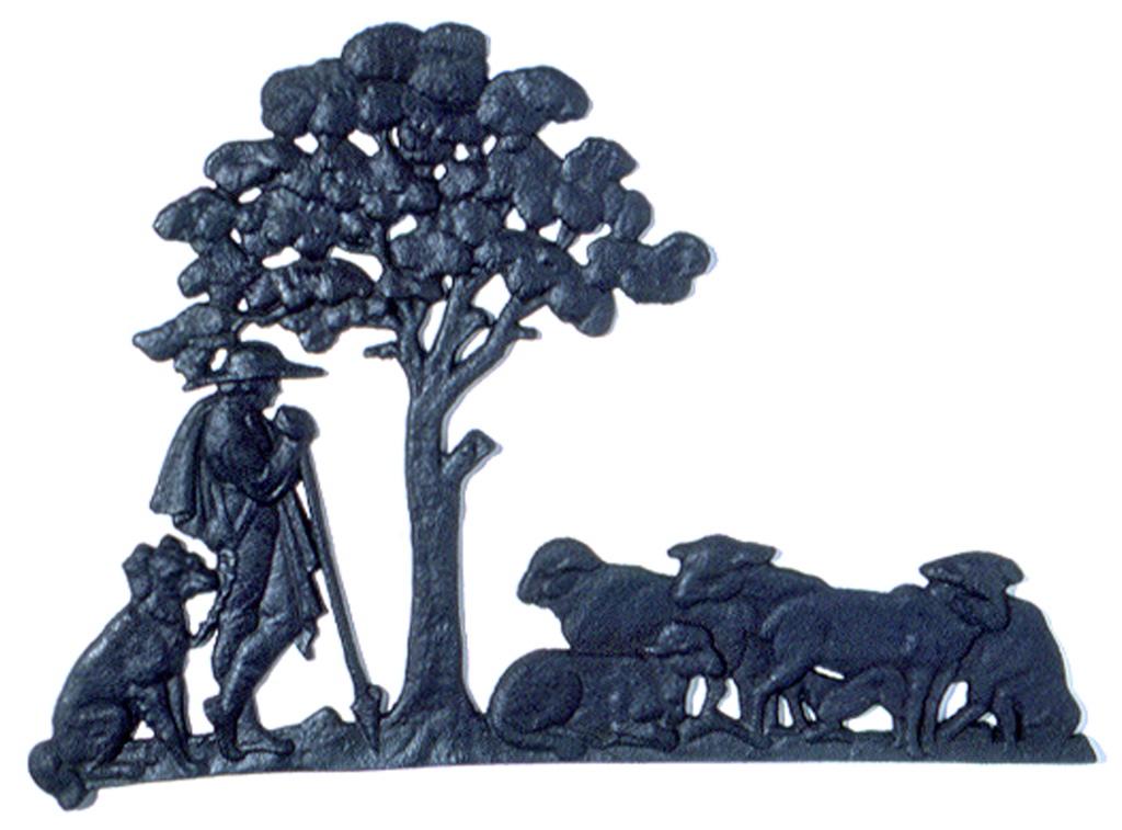 scène pastorale : à gauche d'un arbre, un berger debout s'appuie sur son bâton. Son chien est tenu en laisse et est assis à côté de lui. A droite du berger, un petit troupeau paît. Il se compose de six moutons dont une brebis qui allaite son agneau.