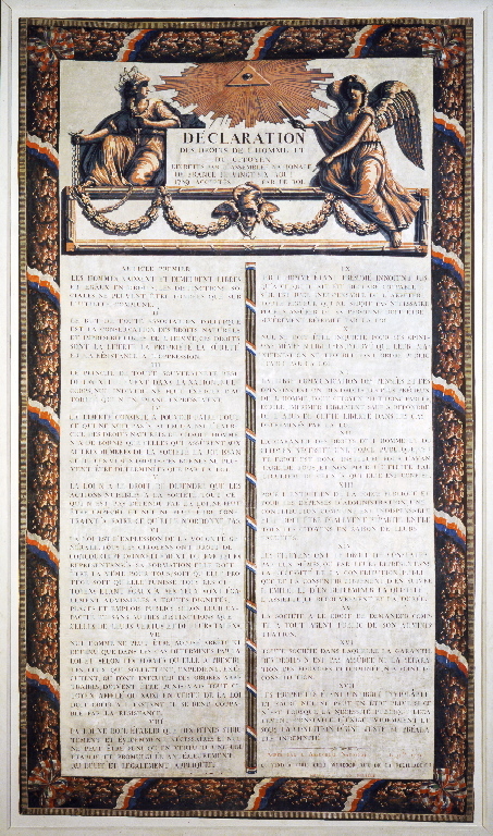 Texte de la première déclaration des droits de l'homme proclamée par l'Assemblée nationale le 26 août 1789. Le décor reprend une gravure d'après Barbier l'aîné : à gauche la France qui a brisé ses fers, à droite la Loi indique du doigt les droits de l'Homme et de son sceptre 'l'oeil suprême de la Raison qui vient dissiper les nuages de l'erreur qui l'obscurcissaient'. Papier vergé rabouté. Indépendamment de la bordure, l'ensemble est formé de huit feuilles (h. 0,418 m, l. 0,522 m à gauche ; h. 0,410 m, l. 0,535 m à droite), surmontées de trois feuilles pour l'allégorie dans la partie supérieure (de gauche à droite : h. 0,547 m, l. 0,323 m puis 0,547 m, l. 0,420 m. Enfin, h. 0,547 m , l. 0,307 m). Fond brossé blanc et lissé ; le texte est imprimé en typographie ; l'impression des autres éléments a été réalisée à la planche en détrempe en 7 couleurs. Bordure : papier rabouté (feuille h. 0,446 m, l. 0,116 m) ; rapport : h. 0,375 m, l. 0,116m ; les noeuds de rubans sont rapportés aux coins pour masquer les raccords.