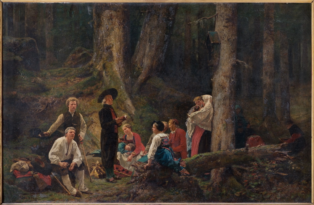 scène (homme, femme, enfant, repos, prêtre, prière) ; forêt