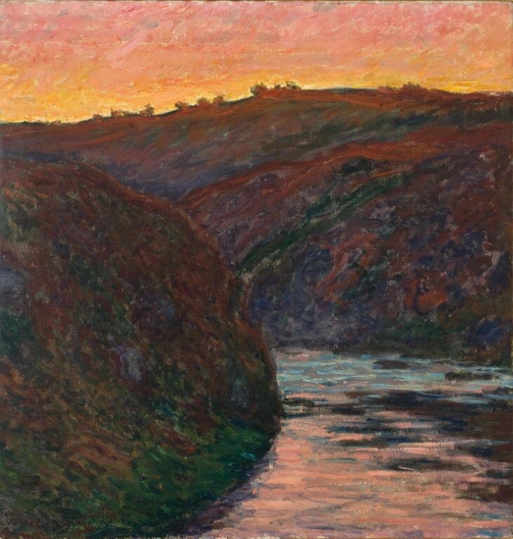 Claude Monet 89 (b.g.) ; revers : Monet N 8486 ; A 1 Monet La Creuse 1889 N 208 6278 ; La Vallée de la Creuse - Lender Durand-Ruel inc. N° 57 ; 6278 Cl. Monet - Paysage de la Creuse Soleil couchant 1889 ; Claude Monet : Exhibition Apr. 11th to May 12th ; 1945 Wildenstein et Cie Inc. New York NY 1889