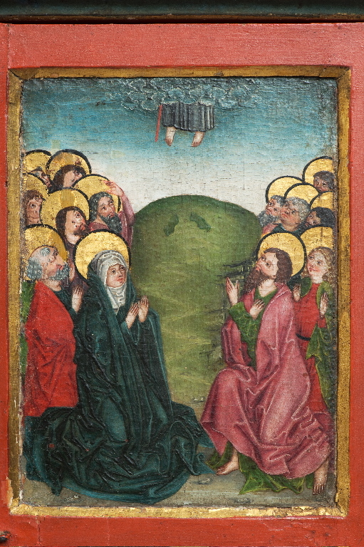scène biblique (cycle narratif, vie de la Vierge) : scène biblique (Annonciation : Vierge, Ange, Dieu le Père) ; scène biblique (Visitation : Vierge, Elisabeth, Joseph) ; (Présentation au Temple) ; scène biblique (Nativité) - scène biblique (Adoration des Mages) ; scène biblique (Résurrection) - scène biblique (Pentecôte) ; scène biblique (Ascension) - scène biblique (Mort de la Vierge)