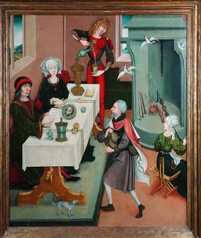 scène historique (saint Jacques le majeur : miracle, oiseaux, volailles, cuisson, personnages, table : repas)