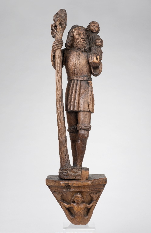 Saint Christophe, au visage barbu, est vêtu d'un surcot. Il porte, attaché à la ceinture, un nécessaire de chasse. Le pantalon est retroussé, les pieds disparaissent dans l'eau. S'appuyant sur un tronc d'arbre, il porte l'Enfant Jésus sur l'épaule gauche, qui lui même tient le globe. La statuette est placée sur un socle décoré d'une sirène bifide. Saint Christophe est sur une console.
