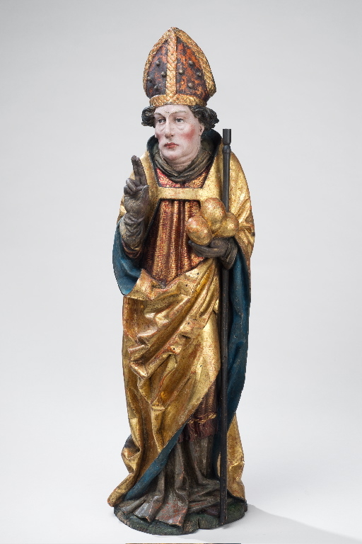 figure (saint Nicolas, en pied, bénissant, attributs : mitre, trois bourses, crosse)