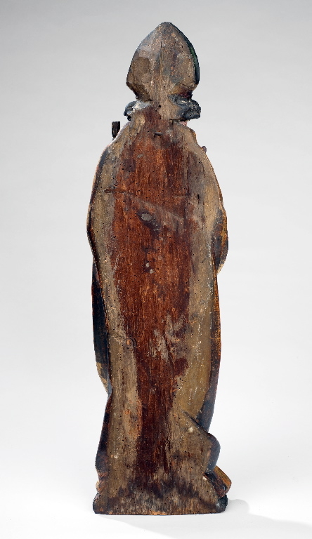 Saint Nicolas est représenté debout, bénissant de sa main droite et tenant de sa main gauche les trois bourses d'or, ainsi que le bâton d'évêque dont la crosse manque. Sa tête est coiffée d'une mitre alors qu'il est vêtu de la chape, aube et dalmatique de son sacerdoce. Ses gants souples ont un long revers. La qualité de la sculpture et de sa polychromie est assez remarquable. Les traits du visage, alourdis par l'âge et les ridules, sont particulièrement réalistes. ; Bois (tilleul?) polychromé