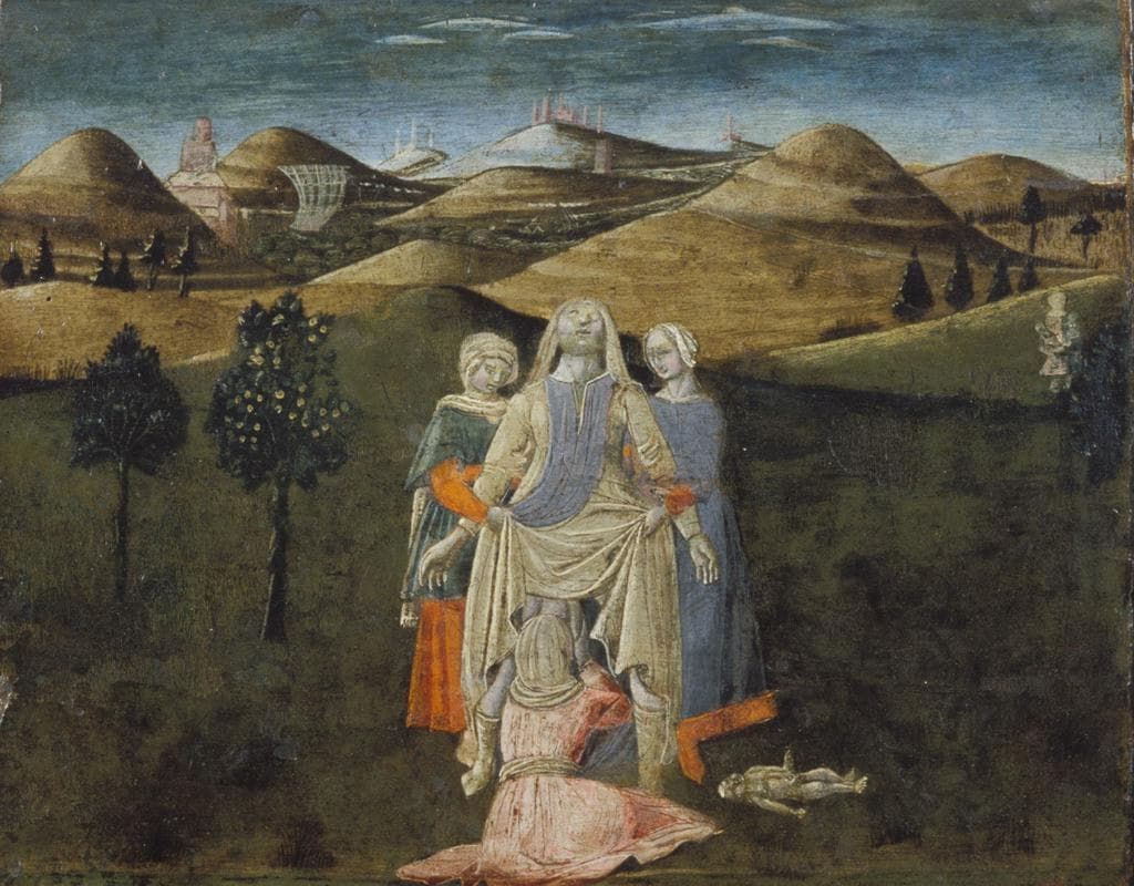 Partie d'une prédelle constituant la partie basse d'un polyptyque composé de panneaux hiérarchisés sur différents étages. La prédelle, faite de tableautins relatant la vie d'un saint ou la Passion du Christ. Etage le moins ' noble ' du polyptyque, la prédelle est plus colorée, anecdotique et narrative, elle constitue la partie du retable que le fidèle peut voir le mieux sans lever la tête.