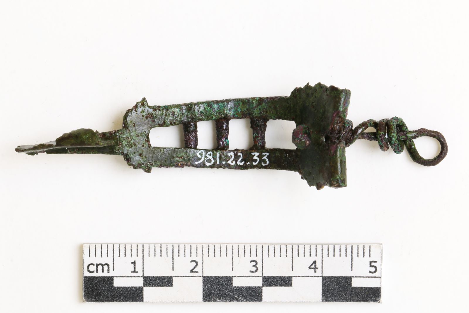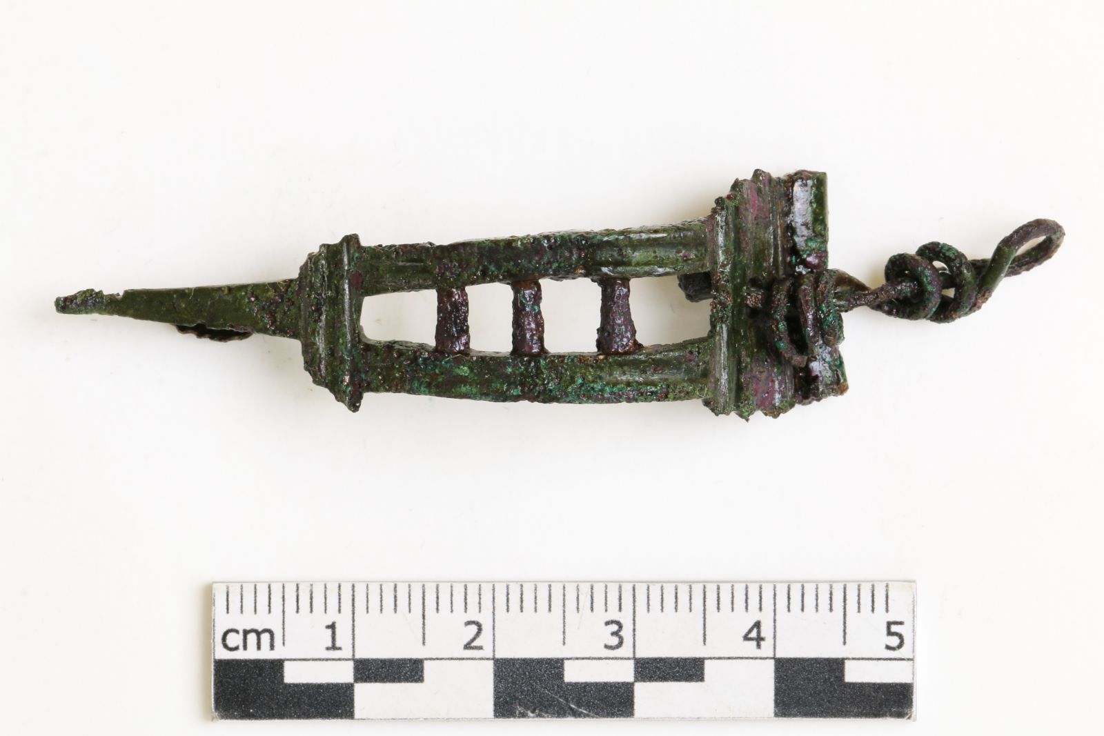 Type 22d de Feugère. Fibule de type Bagendon. L'arc se compose de deux tiges reliées par trois barrettes droites. Le départ d'une chaînette subsiste. L'ardillon est manquant.