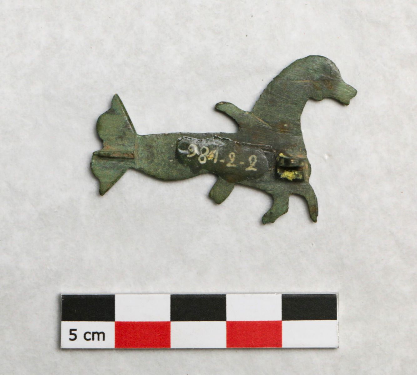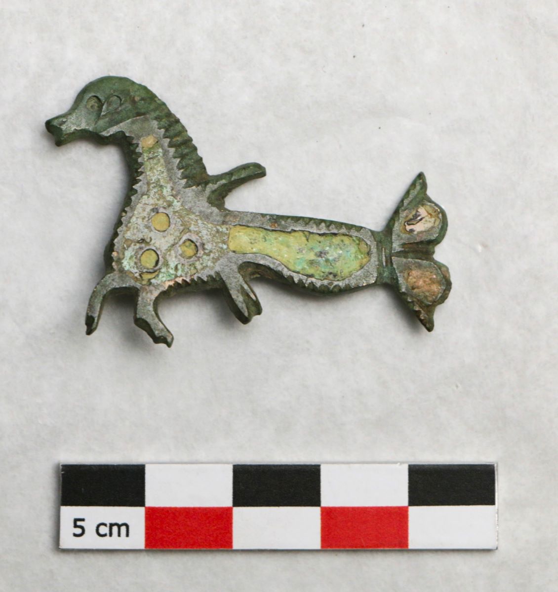 Fibule en forme d'hippocampe, trois cercles ornent le poitrail et la silhouette est soulignée par un motif en dent de scie.