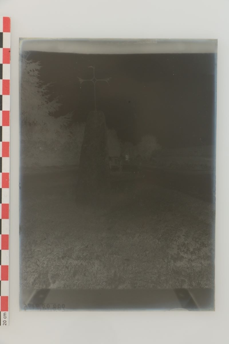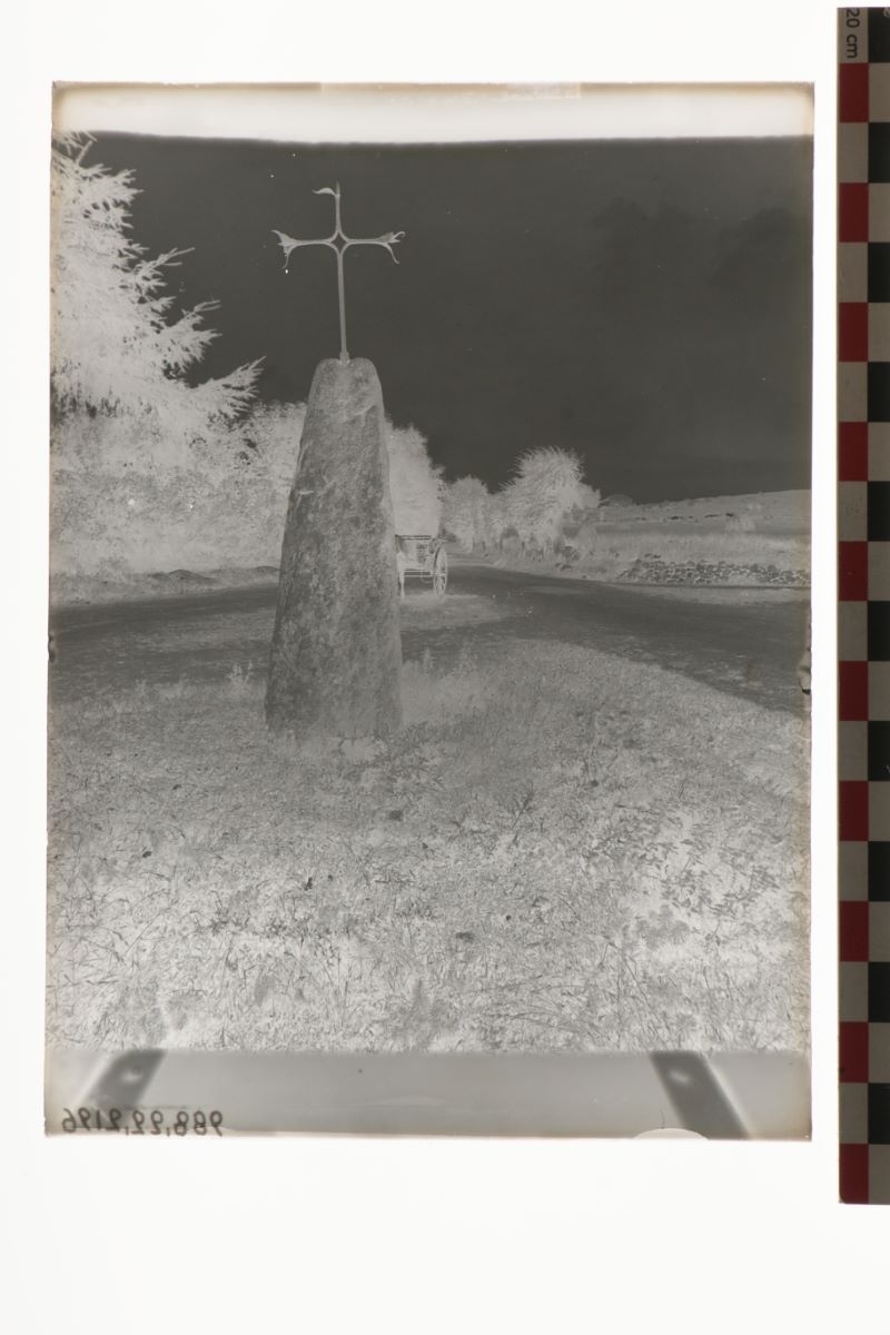 Menhir de Thedde (Saint-Genès-Champanelle, Puy-de-Dôme) surmontée d'une croix en fer forgé. Présence d'une calèche en arrière plan. Présence du support de l'appareil photo.