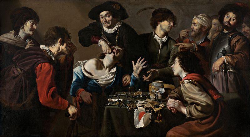 Au centre de la composition, un homme debout arrache une dent à un autre homme assis. Ce dernier lève la main gauche en signe de douleur. Autour de lui, d'autres personnages se pressent. Sur le plateau de la table sont disposés des pots à médicaments ainsi que des instruments de dentiste. Un diplôme posé sur la table atteste de la qualité de l'homme qui opère.