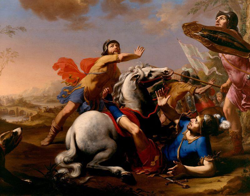 scène biblique (bataille, soldat, saint Paul, vision, bouclier, arme : épée, cuirasse, drapeau, cheval, chien)