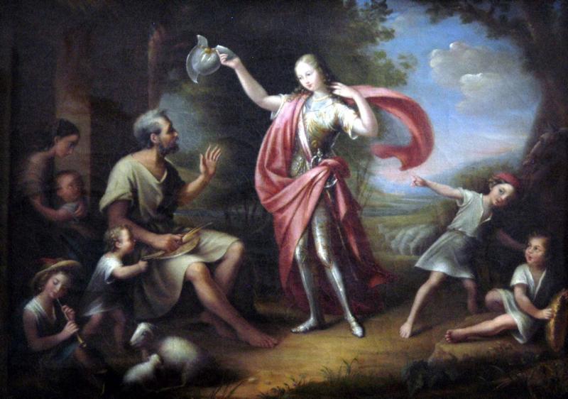 scène (Herminie, armure, casque, draperie, berger, enfant : musique : flûte, mouton, panier) ; fond de paysage (arbre, forêt)